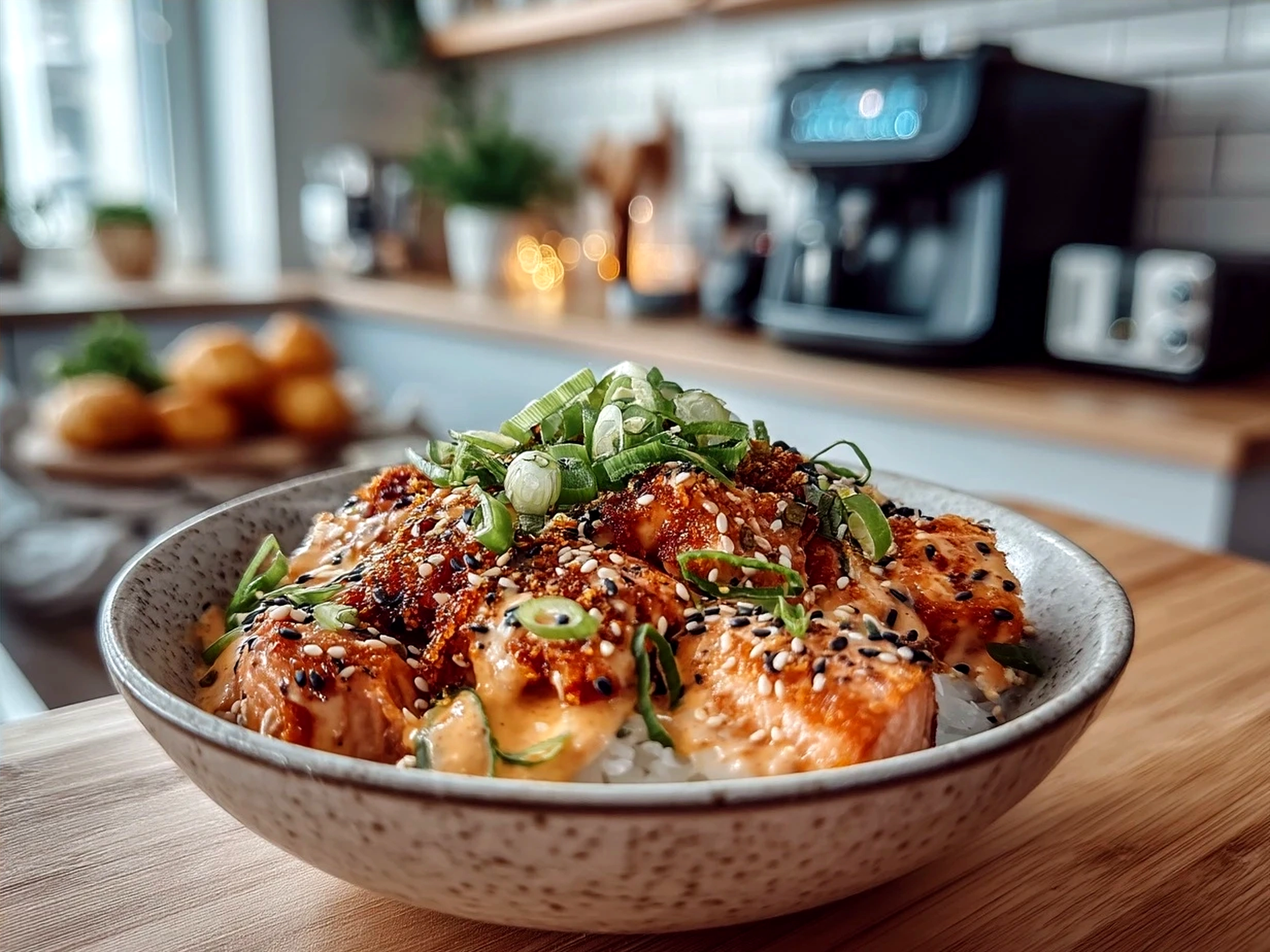 - Drizzle the spicy mayo sauce over the salmon and garnish with green onions. Your Air Fryer Salmon Bowl With Spicy Mayo is ready to serve with fresh, bold flavors.
