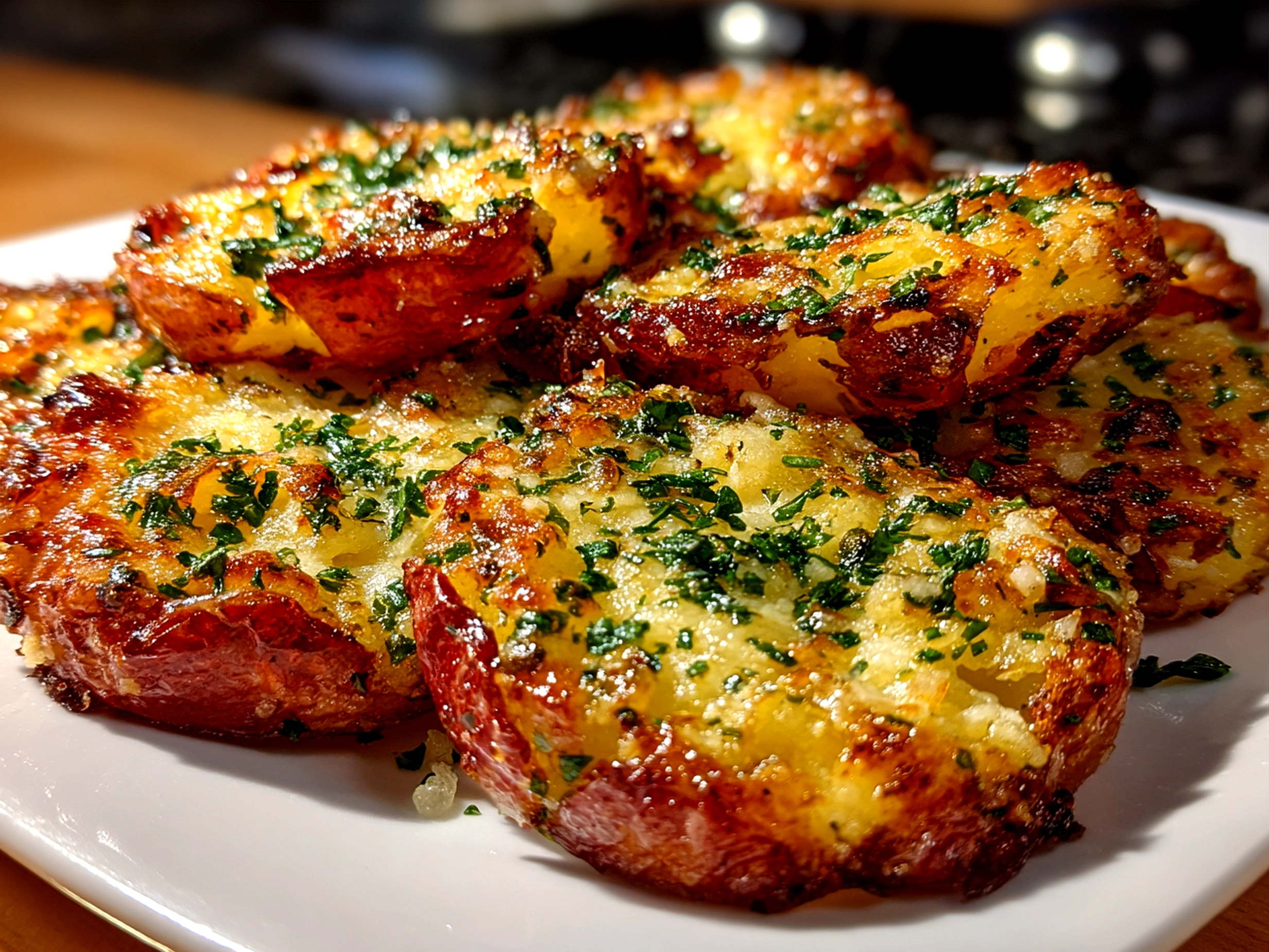 - Garnish and serve: Remove from the oven and garnish with freshly chopped parsley if you like. Serving these Baked Smashed Garlic Parmesan Potatoes hot ensures the best crispness and aroma in your kitchen.