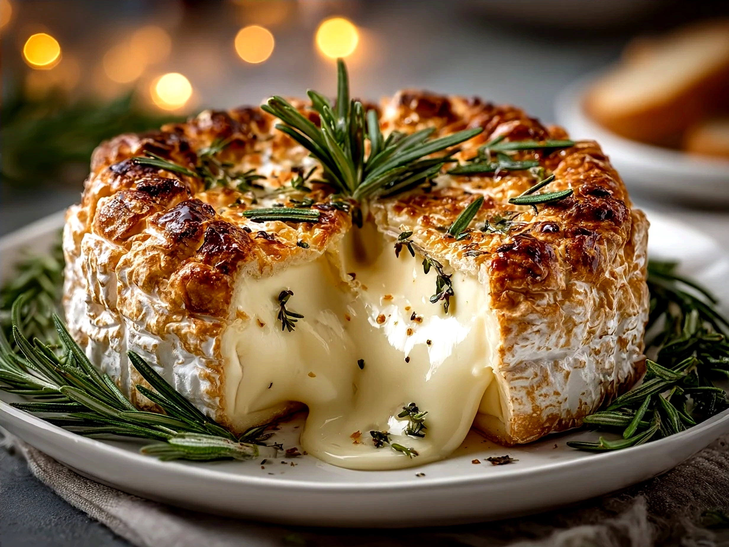 A beautifully presented Brie cheese wheel garnished with a fragrant rosemary wreath, perfect for elegant gatherings and charcuterie boards.