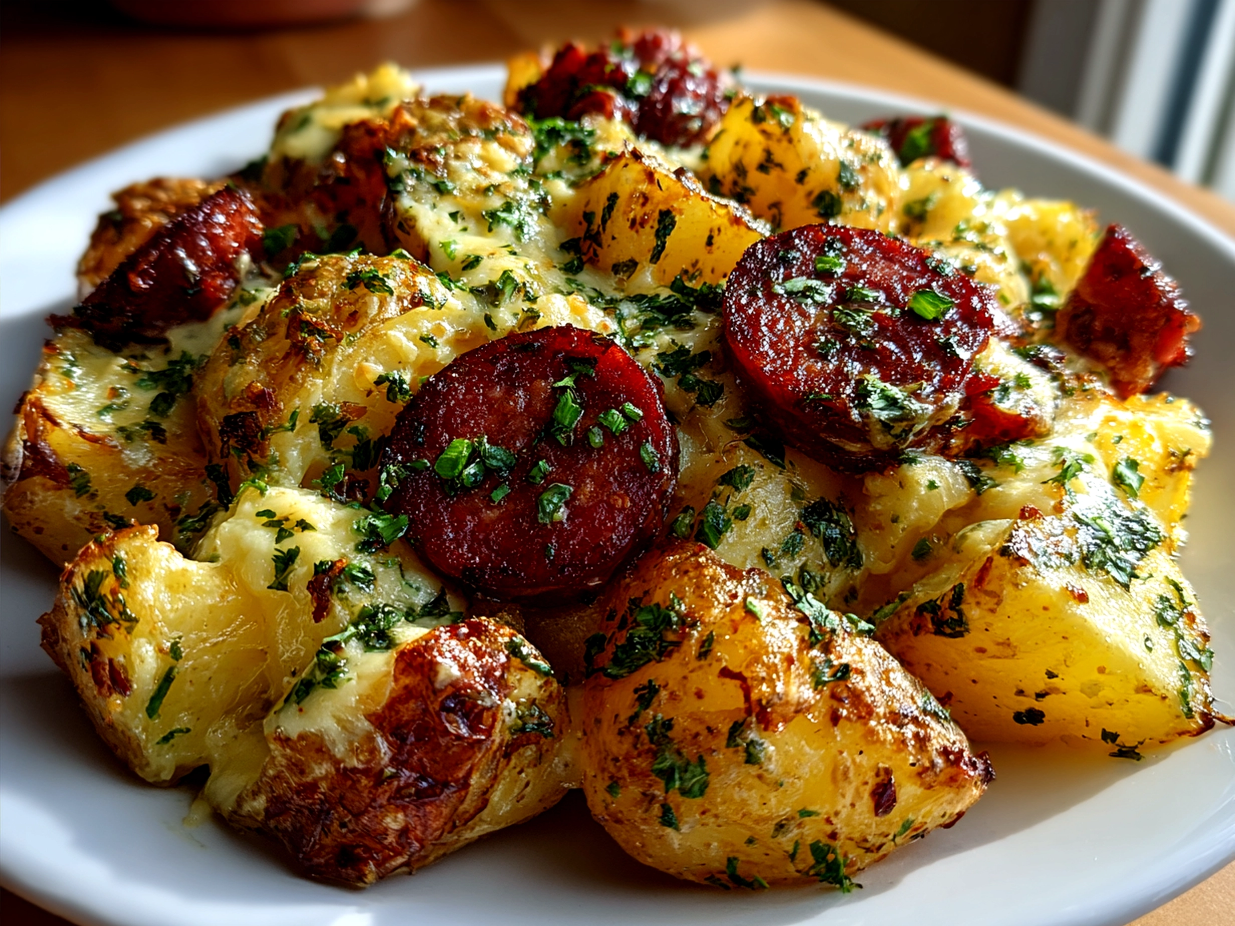 This Cheesy Ranch Potatoes and Smoked Sausage dish combines tender potatoes, flavorful ranch seasoning, melted cheese, and savory smoked sausage for an easy and hearty meal perfect for any night.