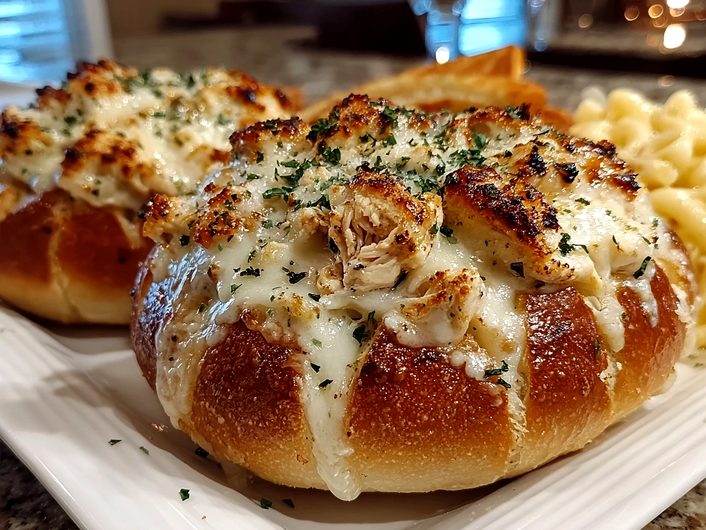 Served Chicken Alfredo Garlic Bread Bowls with melted cheese and garnish