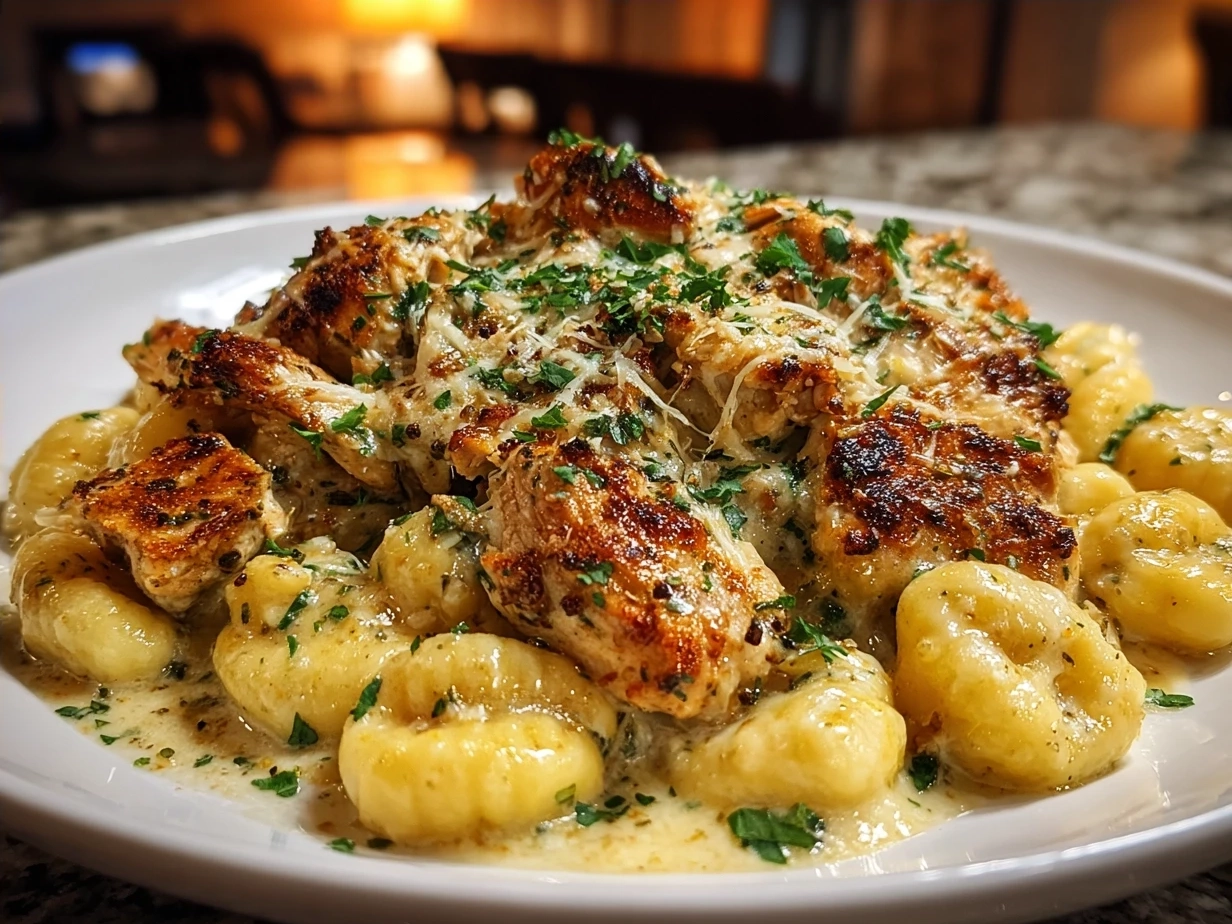 A creamy and comforting Chicken Alfredo Gnocchi dish featuring tender gnocchi and succulent chicken in a rich Alfredo sauce, perfect for a satisfying weeknight dinner.