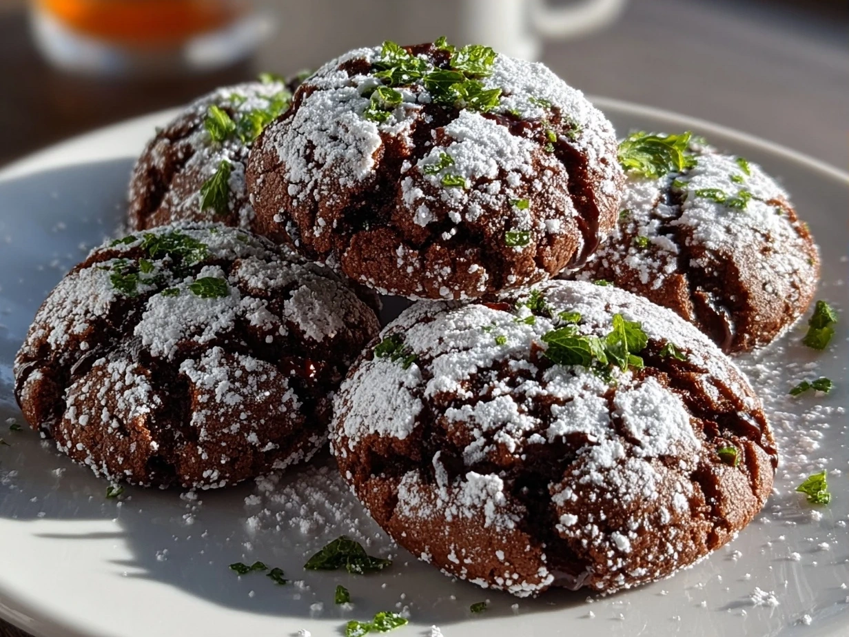 Deliciously soft and fudgy chocolate crinkle cookies infused with refreshing mint flavor, perfect for any festive occasion or as an indulgent treat.