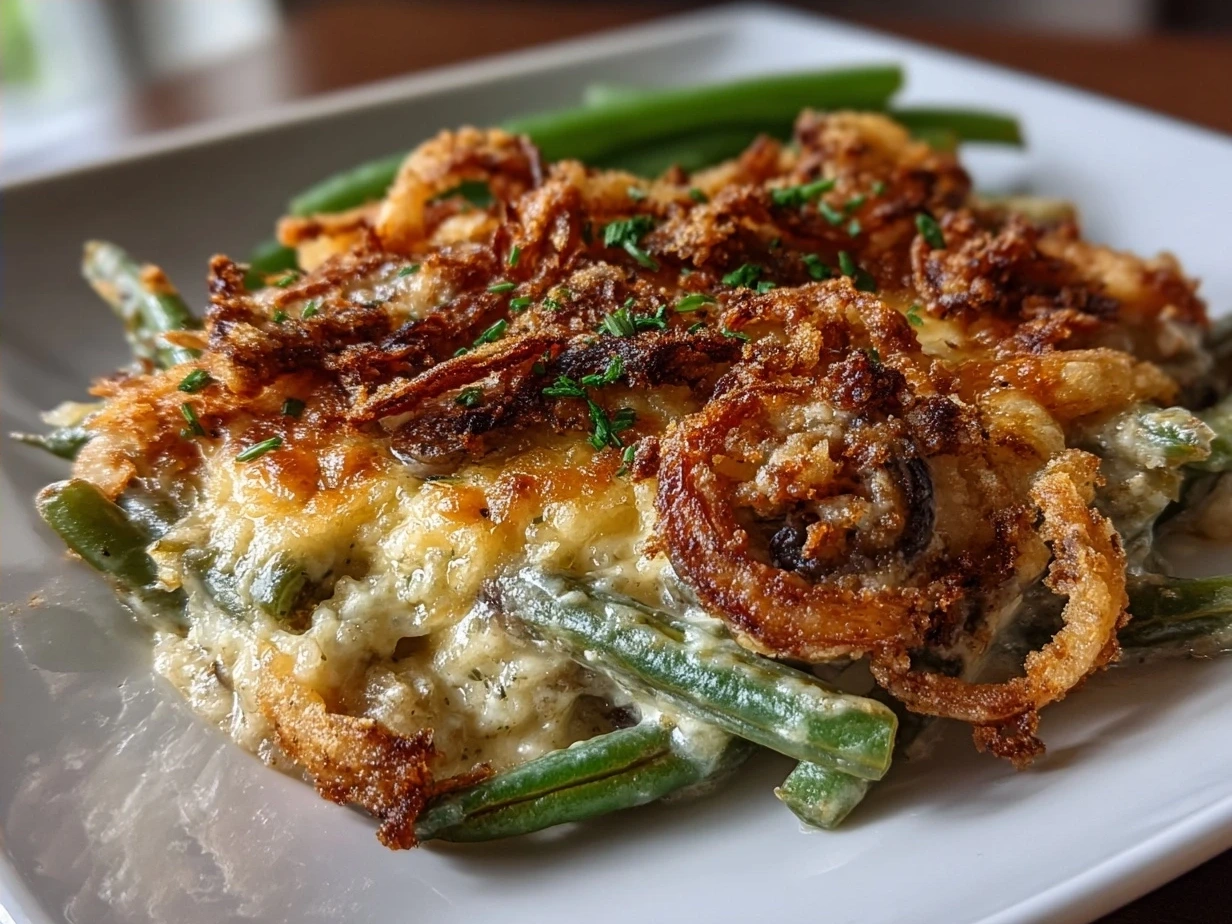 This classic homemade green bean casserole features tender green beans in a creamy mushroom sauce topped with crispy fried onions, perfect as a comforting side dish for any meal.