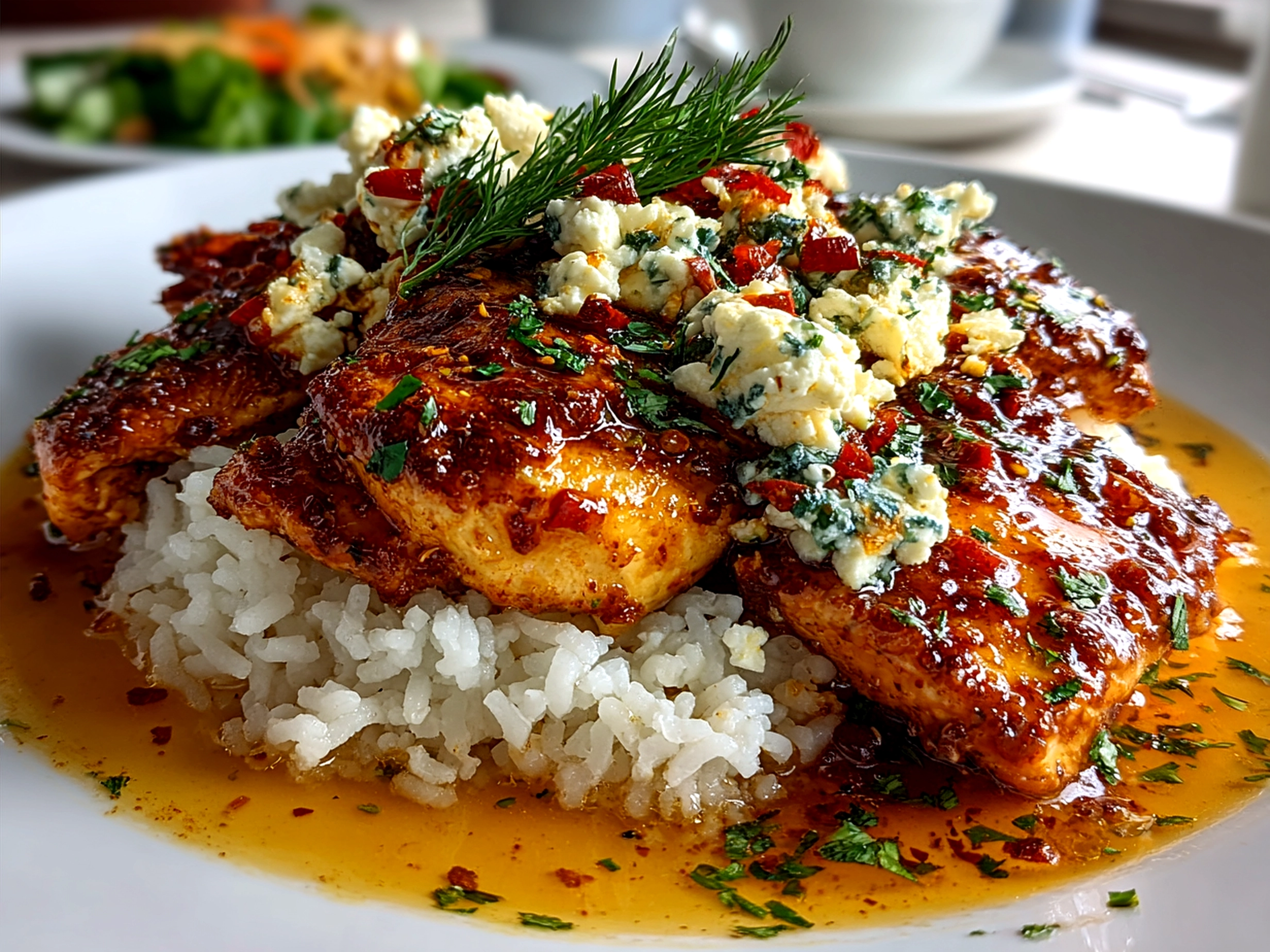 A flavorful and spicy baked chicken dish featuring creamy feta cheese infused with hot honey, perfect for a quick and delicious dinner.