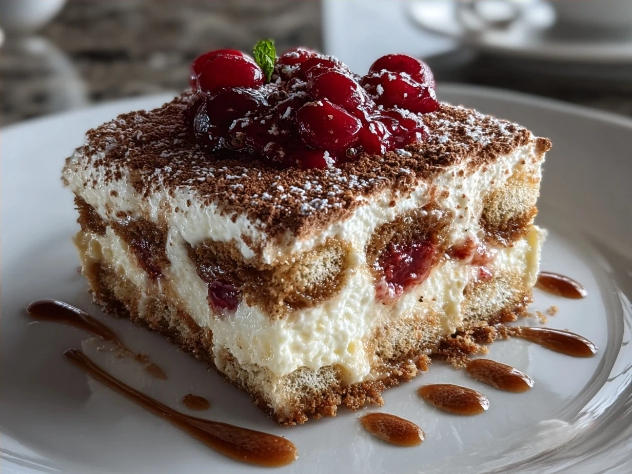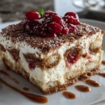 Indulge in this elegant Luxe Cranberry Tiramisu featuring layers of creamy mascarpone, tart cranberries, and delicate ladyfingers soaked in espresso, perfect for festive occasions.