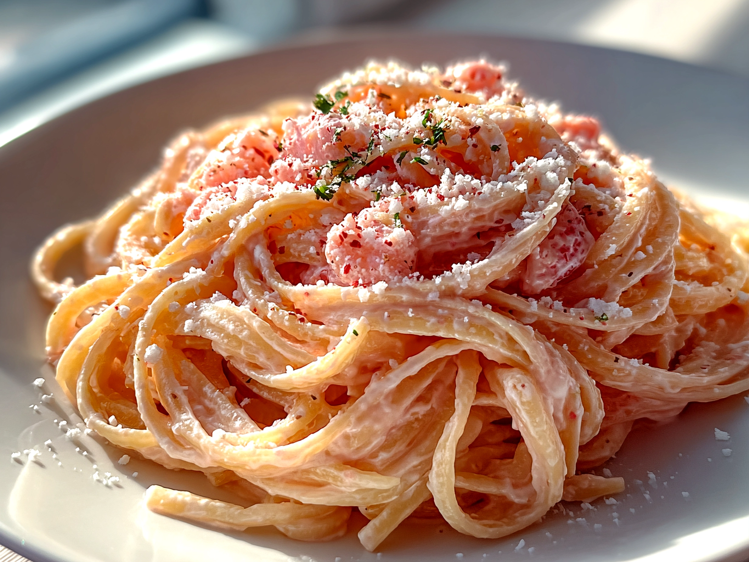A luscious and vibrant vegan pasta dish featuring a creamy pink sauce made from cashews and roasted red peppers, perfect for a healthy, flavorful meal.