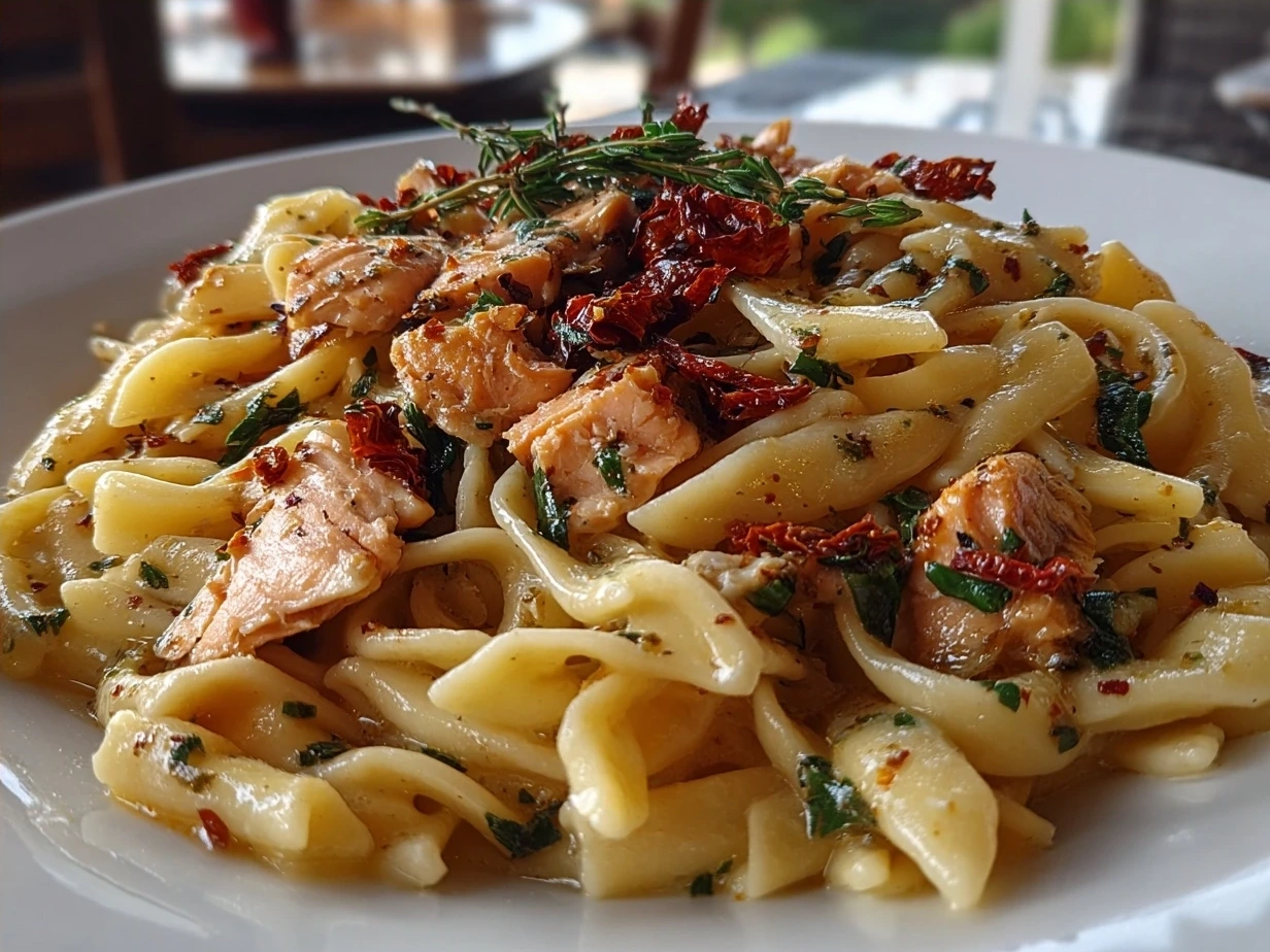 A creamy and flavorful salmon pasta infused with sundried tomatoes, perfect for a quick and elegant weeknight dinner.