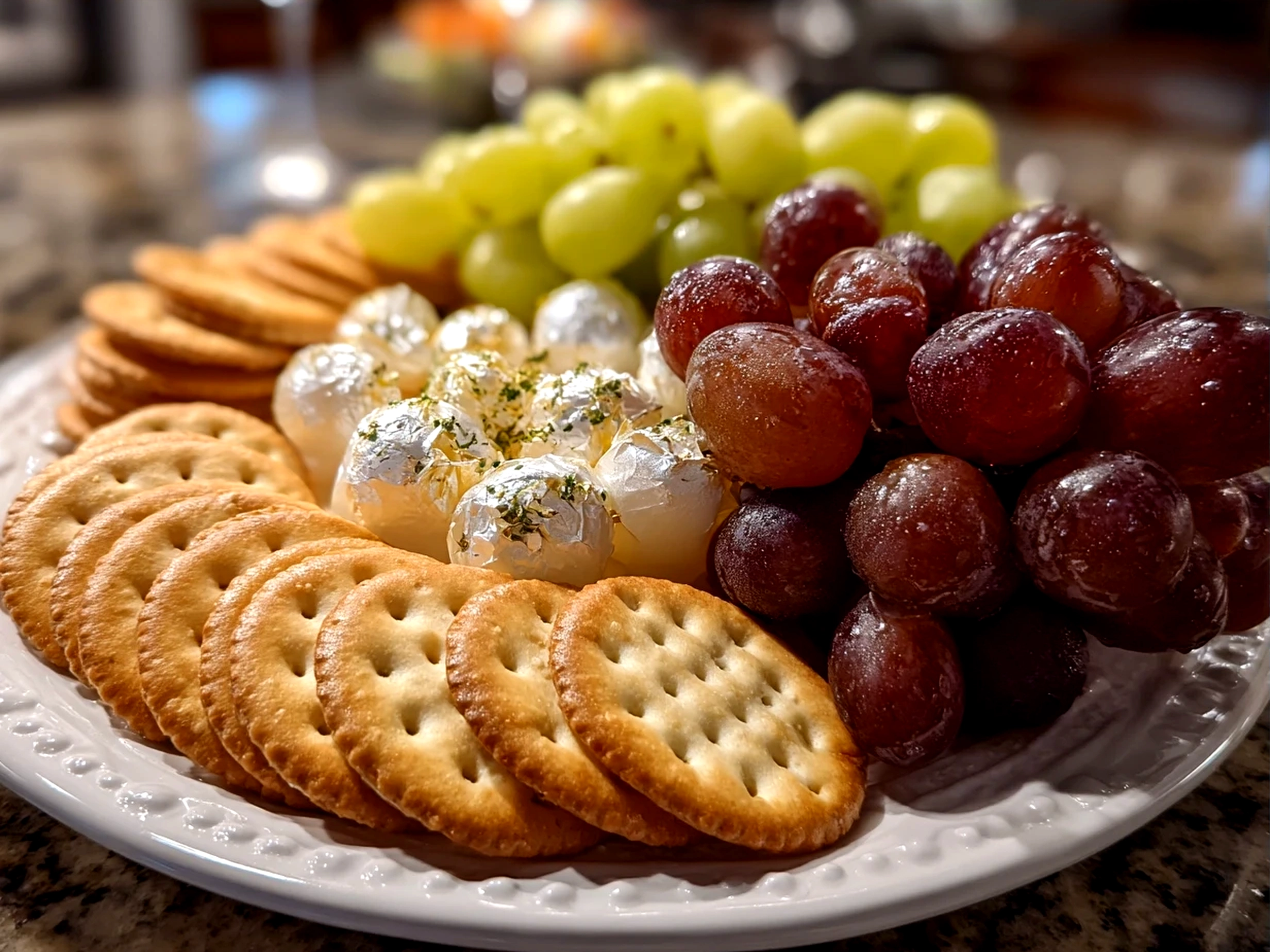 A refreshing and elegant snack featuring crisp silver crackers paired with sparkling grapes, perfect for entertaining or a light bite.