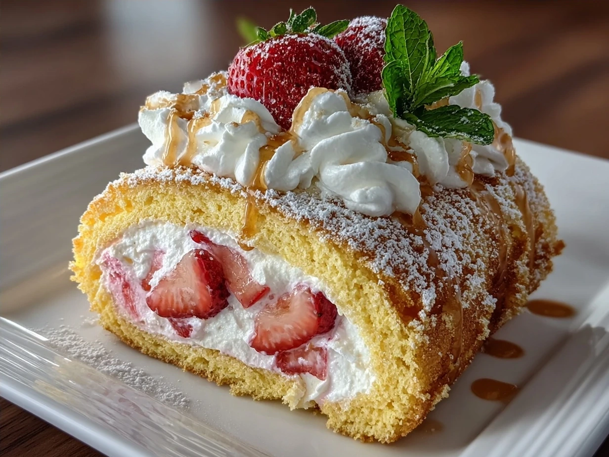 A light and fluffy cake roll filled with sweet whipped cream and fresh strawberries, perfect for any dessert craving or special occasion.