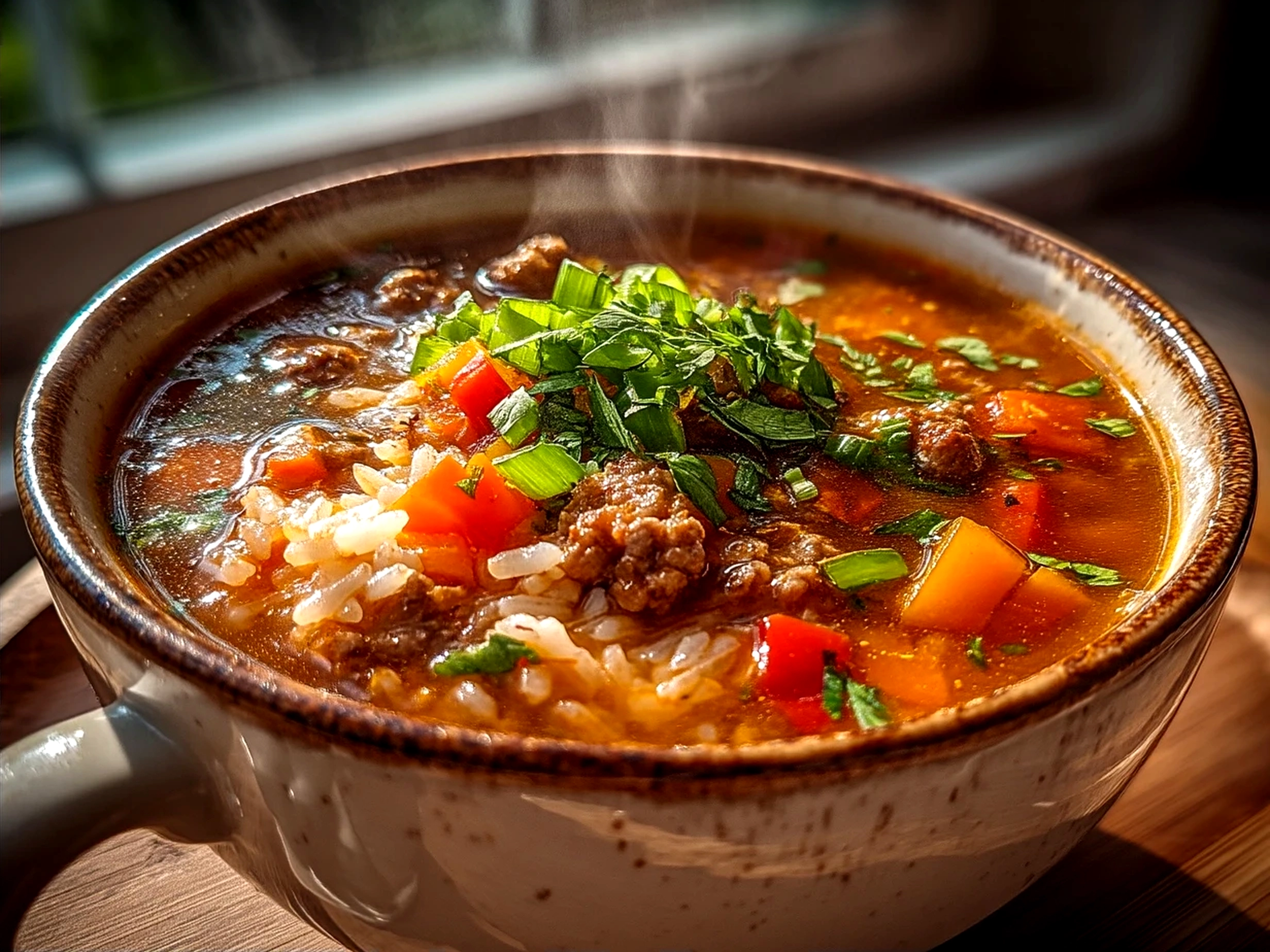 A hearty and comforting soup inspired by classic stuffed peppers, featuring ground beef, bell peppers, tomatoes, and rice simmered in a flavorful broth.