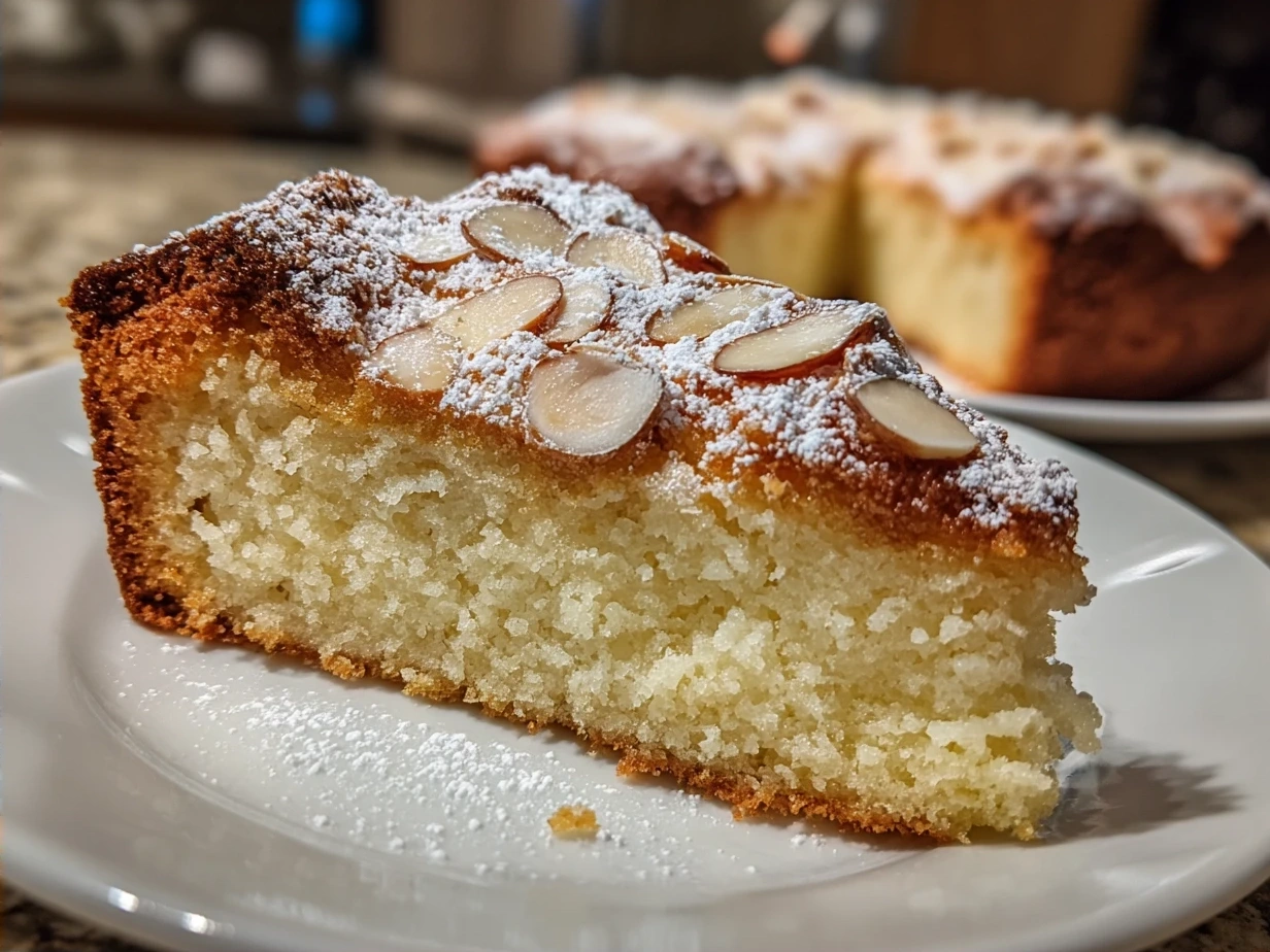 A delicate and moist white almond cake featuring a tender crumb and subtle almond flavor, perfect for celebrations or an elegant dessert.